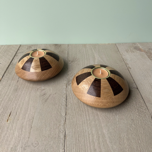 Houten ronde Theelicht set van 2 stuks, gemaakt uit verlijmde stukken hout.In de houtsoorten: Eiken en Wengé.Behandeld met Deense olie.Buitendiameter 14,5 cmHoogte 6 cm