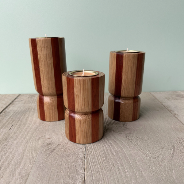 Houten ronde Kandelaar set van 3 stuks, gemaakt uit verlijmde stukken hout.In de houtsoorten: Eiken en Padoek.Behandeld met Deense olie.Buitendiameter 7 cmHoogte 11, 13 en 16 cm