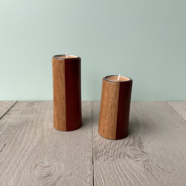 Houten ronde Kandelaar set van 2 stuks, gemaakt uit verlijmde stukken hout.In de houtsoorten: Eiken en Padoek.Behandeld met Deense olie.Buitendiameter 5 cmHoogte 10 en 13 cm