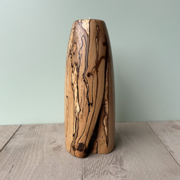 Houten ronde Kandelaar, gemaakt van hout.In de houtsoorten: Spalted Beuken.Behandeld met Deense olie.Buitendiameter 12 cmHoogte 28 cm