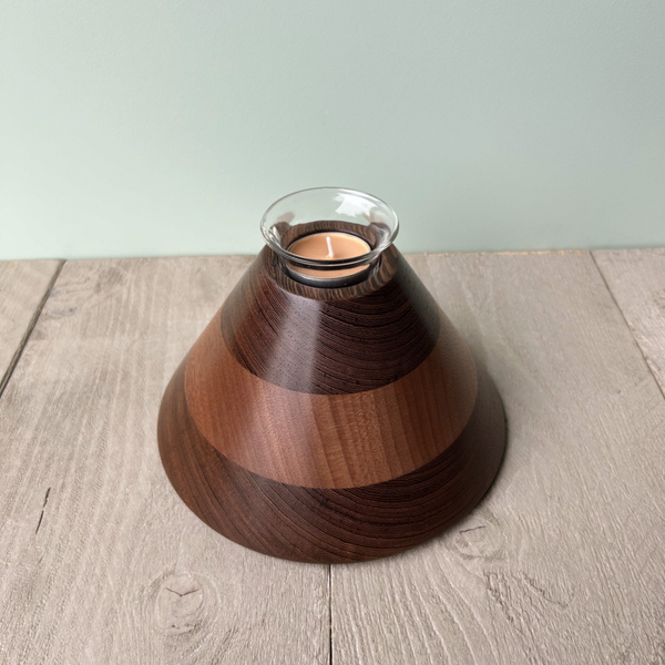 Houten ronde Kaarsenhouder, gemaakt uit verlijmde stukken hout.In de houtsoorten: Mahonie en Wengé.Behandeld met Deense olie.Buitendiameter 19 cmHoogte 11,5 cm