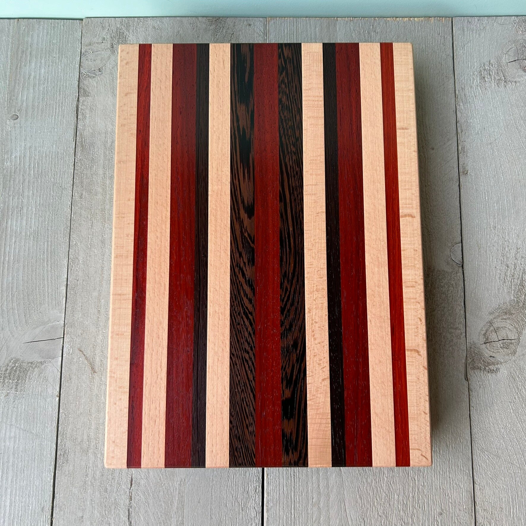 Houten borrelplank/snijplank, gemaakt uit verlijmde stukken hout.In de houtsoorten: Wengé, Padouk en Beuken.Behandeld met Rustins Chopping Board olie.