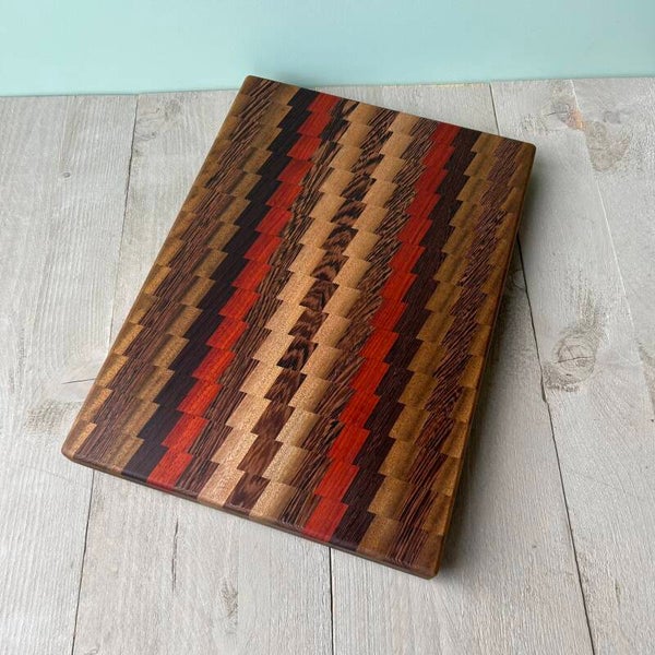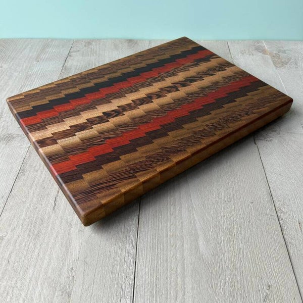 Houten borrelplank/snijplank, gemaakt uit verlijmde stukken hout.In de houtsoorten: Wengé, Padouk en Noten.Behandeld met matte Ciranova Worktop Oil.