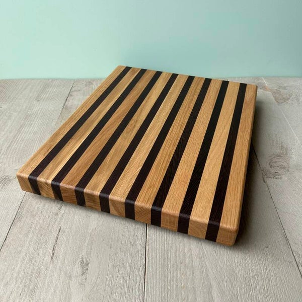 Houten borrelplank/snijplank, gemaakt uit verlijmde stukken hout.In de houtsoorten: Wengé en Eiken.Behandeld met matte Ciranova Worktop Oil.