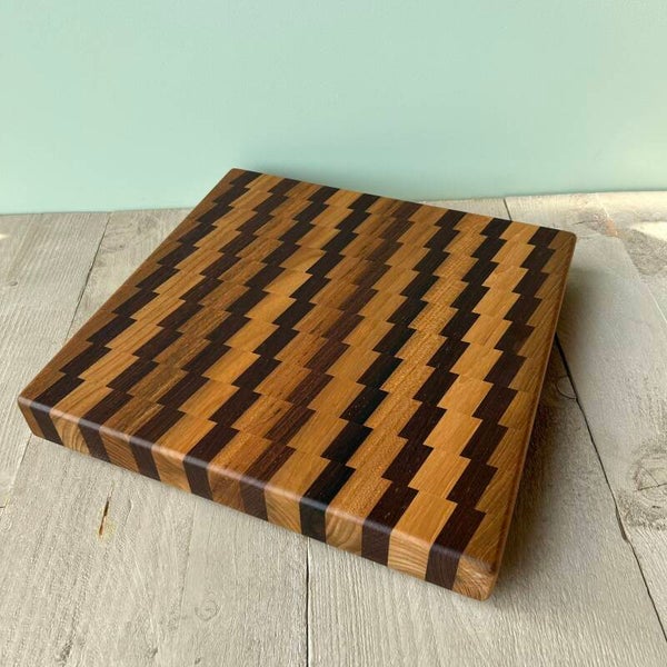 Houten borrelplank/snijplank, gemaakt uit verlijmde stukken hout.In de houtsoorten: Wengé en Noten.Behandeld met matte Ciranova Worktop Oil.