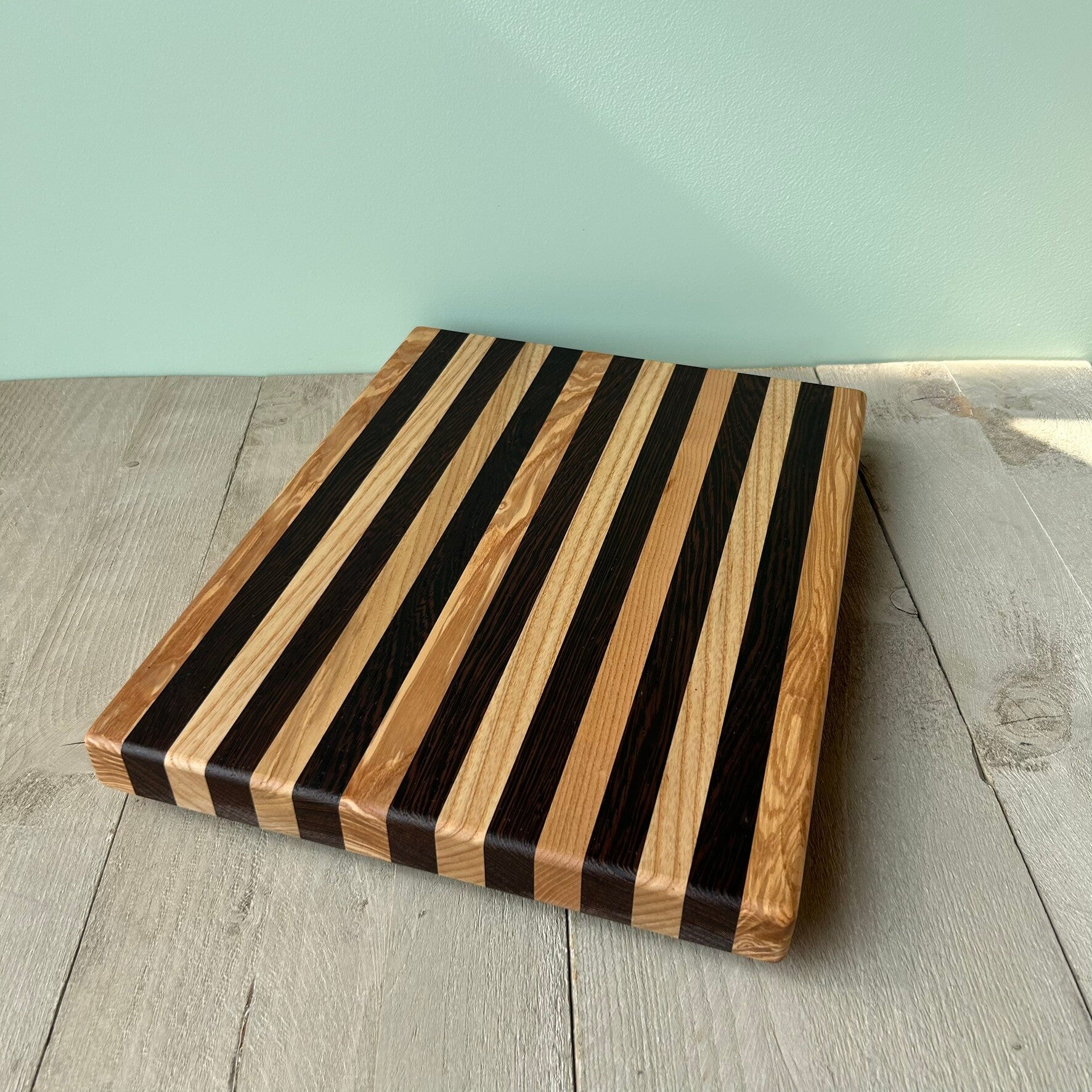 Houten borrelplank/snijplank, gemaakt uit verlijmde stukken hout.In de houtsoorten: Wengé en Essen.Behandeld met matte Ciranova Worktop Oil.