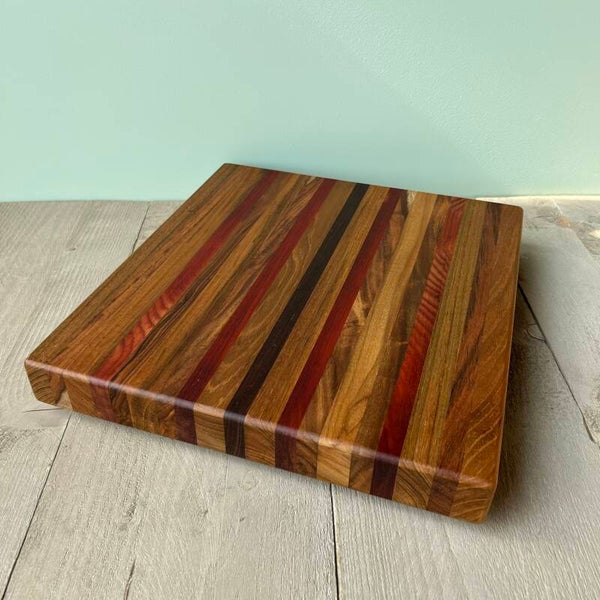 Houten borrelplank/snijplank, gemaakt uit verlijmde stukken hout.In de houtsoorten: Wengé, Padouk en Teak.Behandeld met matte Ciranova Worktop Oil.