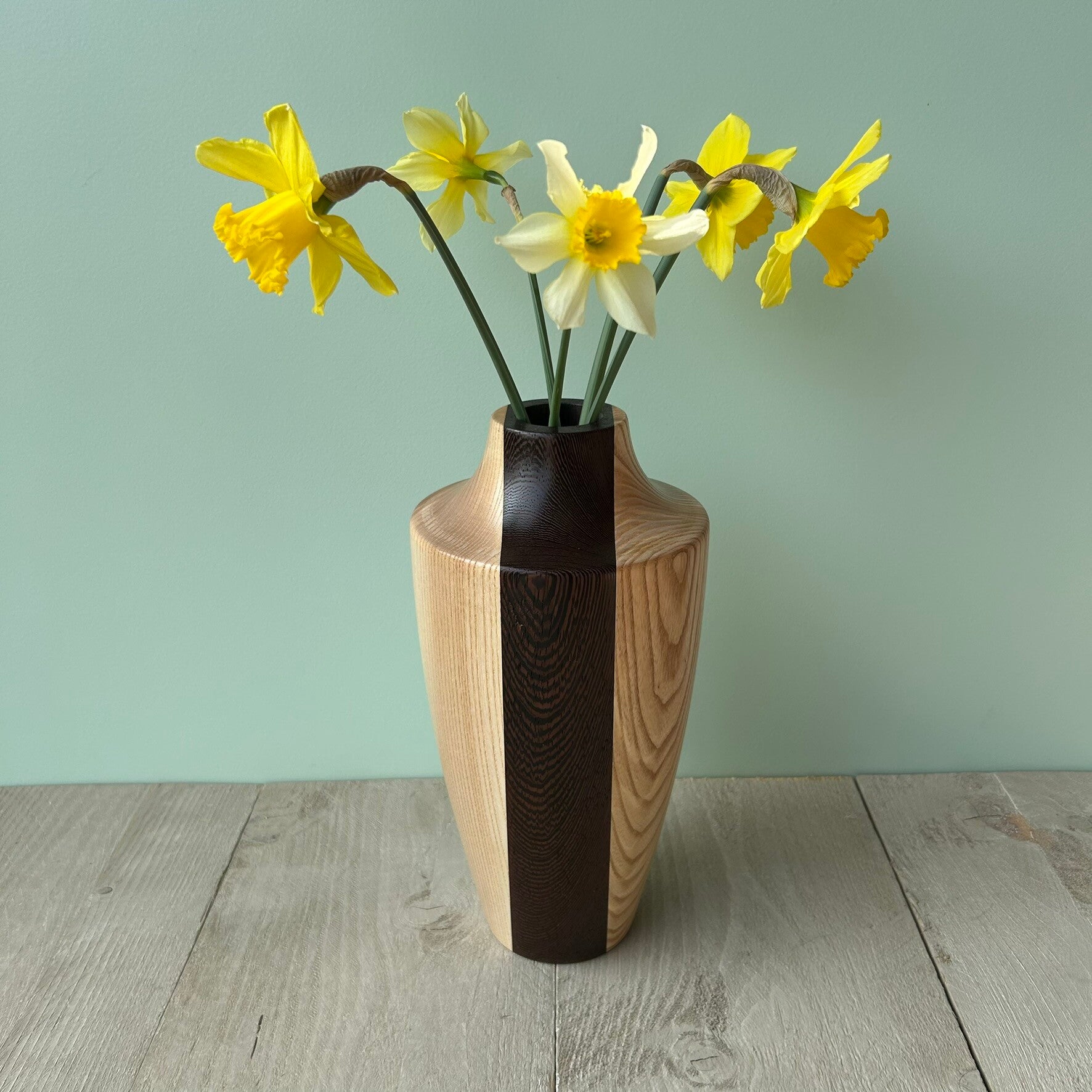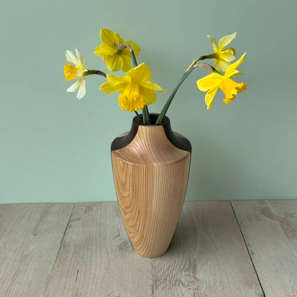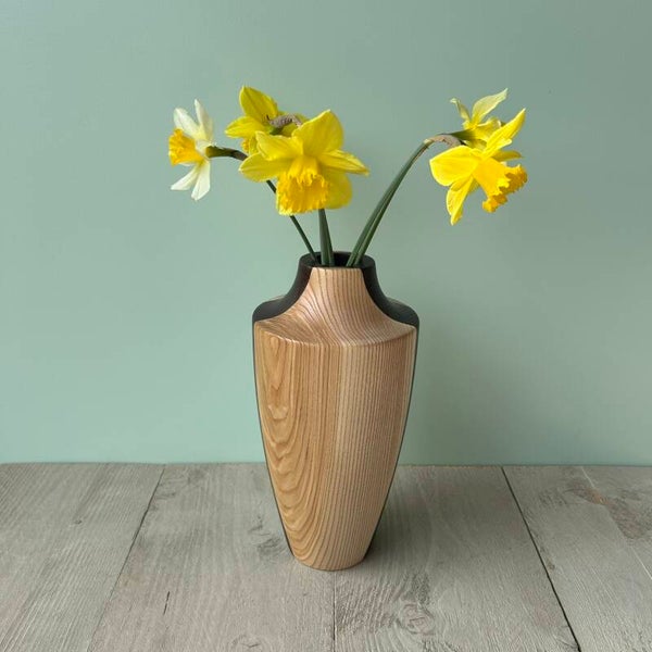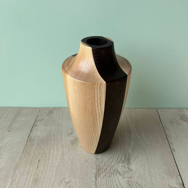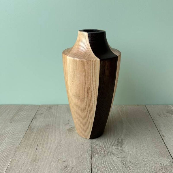 Houten VaasIn de houtsoort: Essen en Wengé.Behandeld met Deense olie.Buitendiameter 14 cmHoogte 28 cm