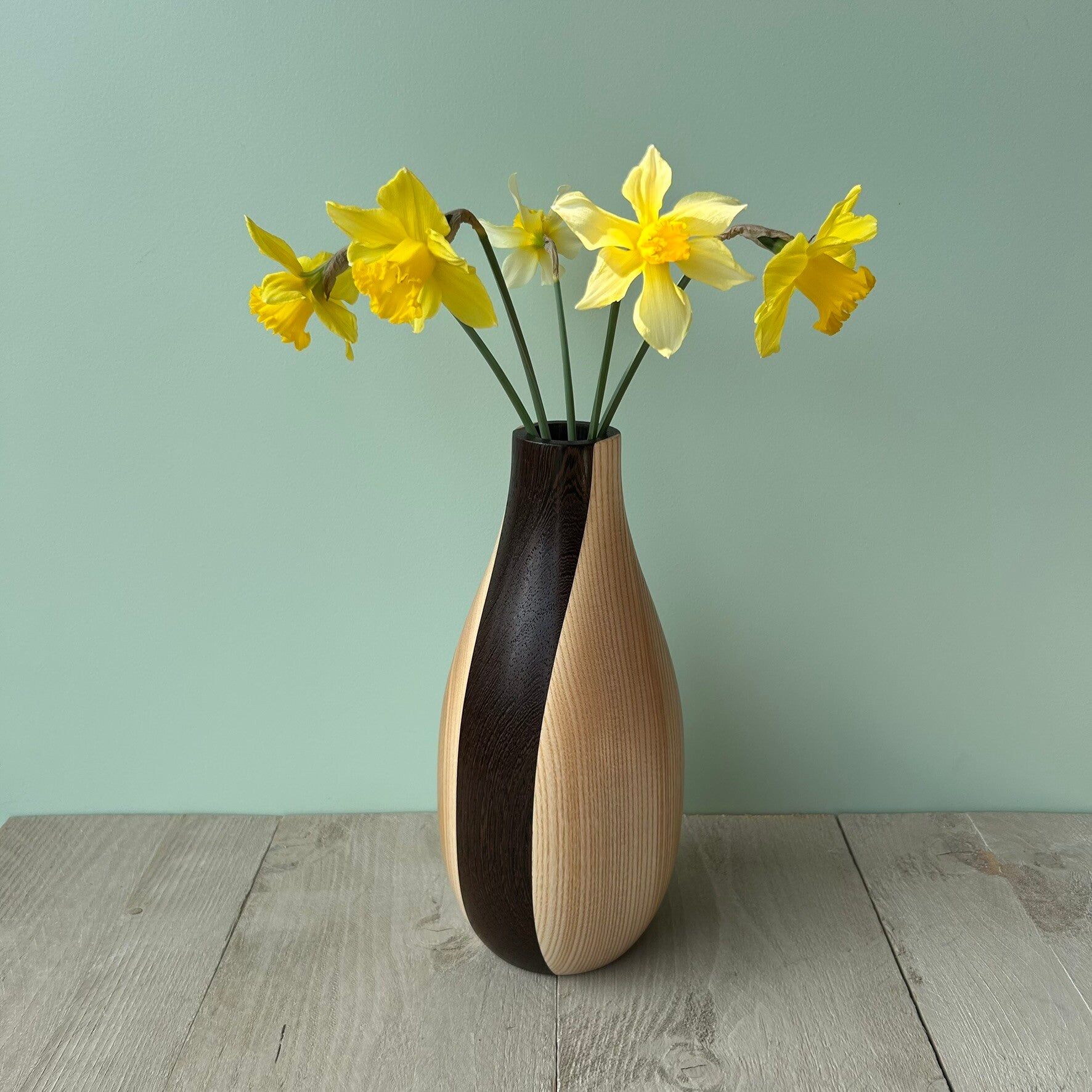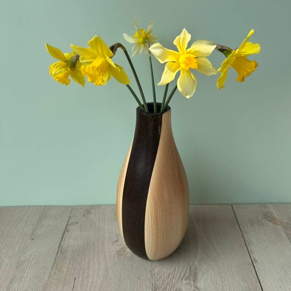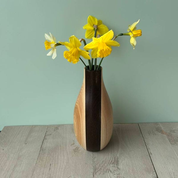Houten VaasIn de houtsoort: Essen en Wengé.Behandeld met Deense olie.Buitendiameter 14 cmHoogte 30 cm