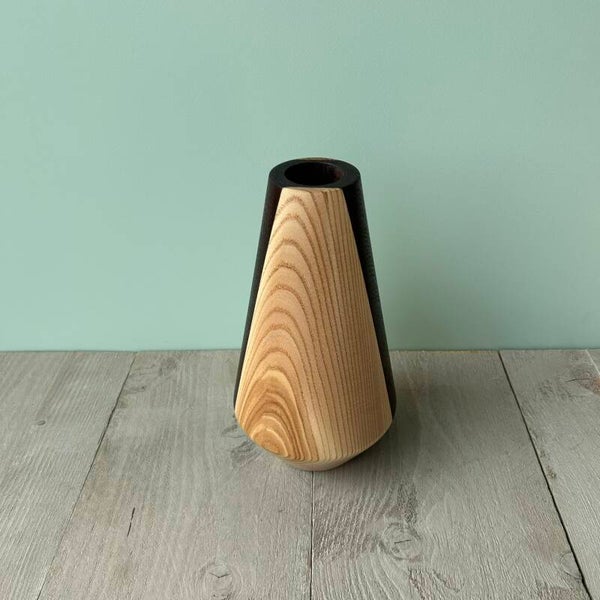 Houten VaasIn de houtsoort: Essen en Wengé.Behandeld met Deense olie.Buitendiameter 14 cmHoogte 25 cm