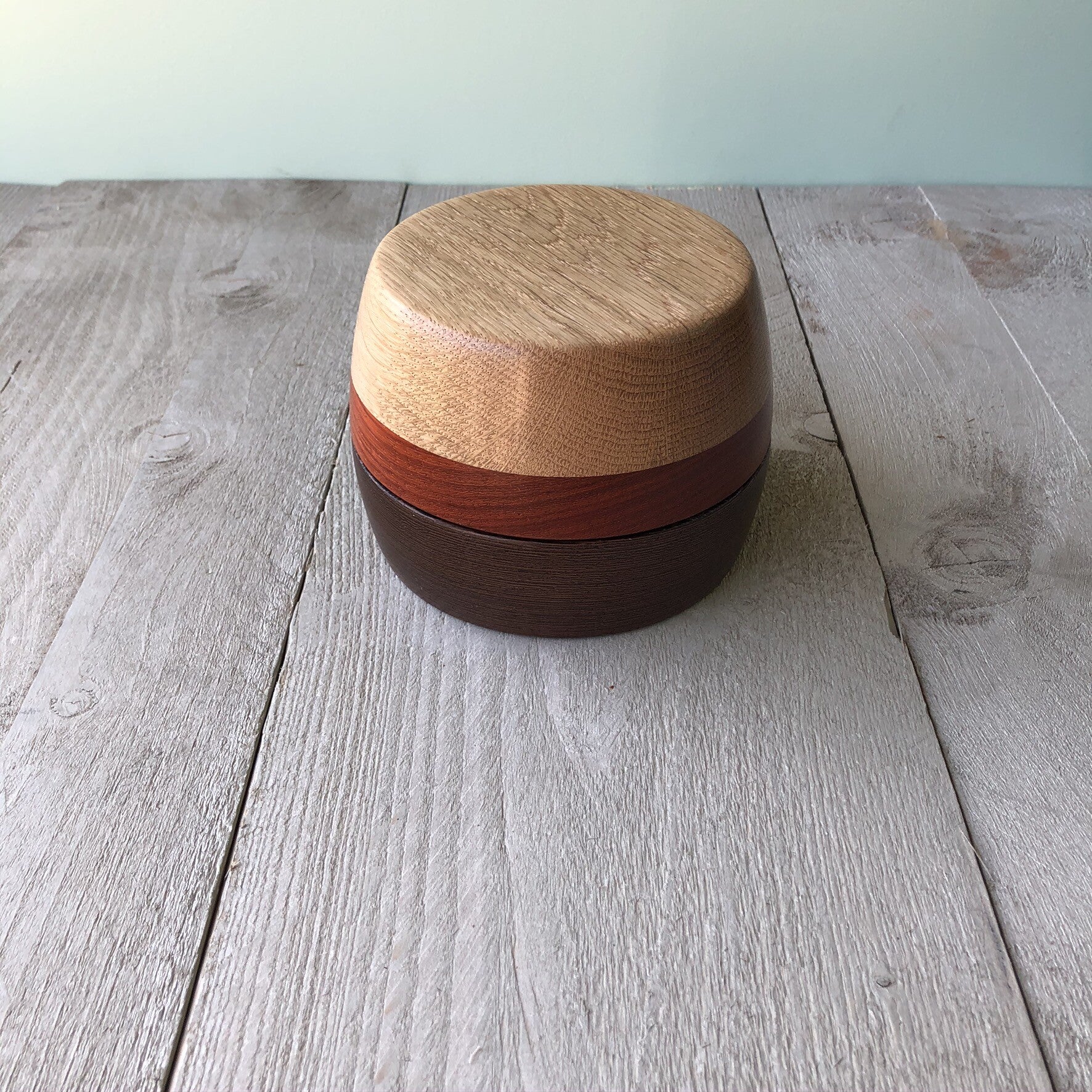 Houten Juwelendoosje/Sierradendoosje, gemaakt uit verlijmde stukjes hout.In de houtsoorten: Wengé, Eiken en Padouk.Behandeld met Deense olie.Buitendiameter 14 cmHoogte 10 cm